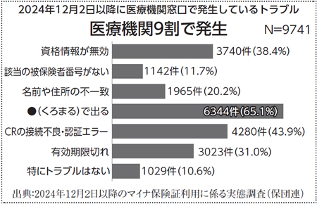 保団連では、これまで5回のトラブル調査を実施し、今年実施した調査では、回答した医療機関の約9割が「名前や住所が●(くろまる)で表示される」「マイナ保険証の有効期限切れ」などのトラブルを経験していました(図)。
